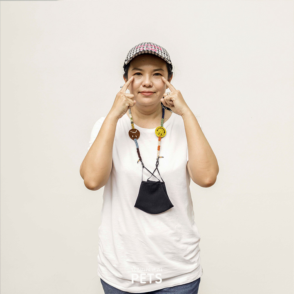 สัญญาณมือ คือ ชี้ไปที่แก้มตัวเอง ที่ตรงไหนที่อยากให้น้องหมาจุ๊บ